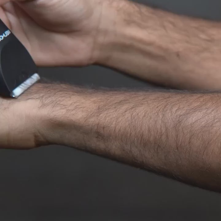 After fully charging your Menhood® grooming trimmer, gently place the silver side of the blade flat against your skin with the soft ceramic side up. Utilize a fresh blade to help reduce grooming accidents.